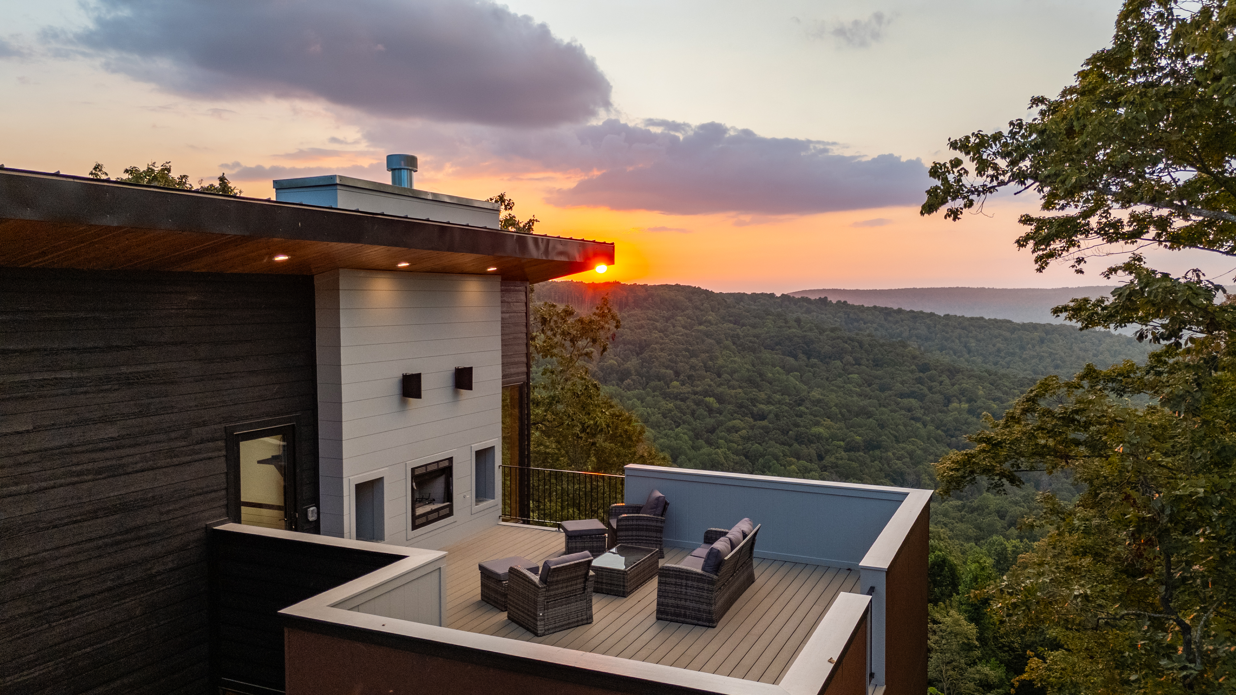 Gather the whole group around the rooftop fireplace as the sun dips below the bluff.