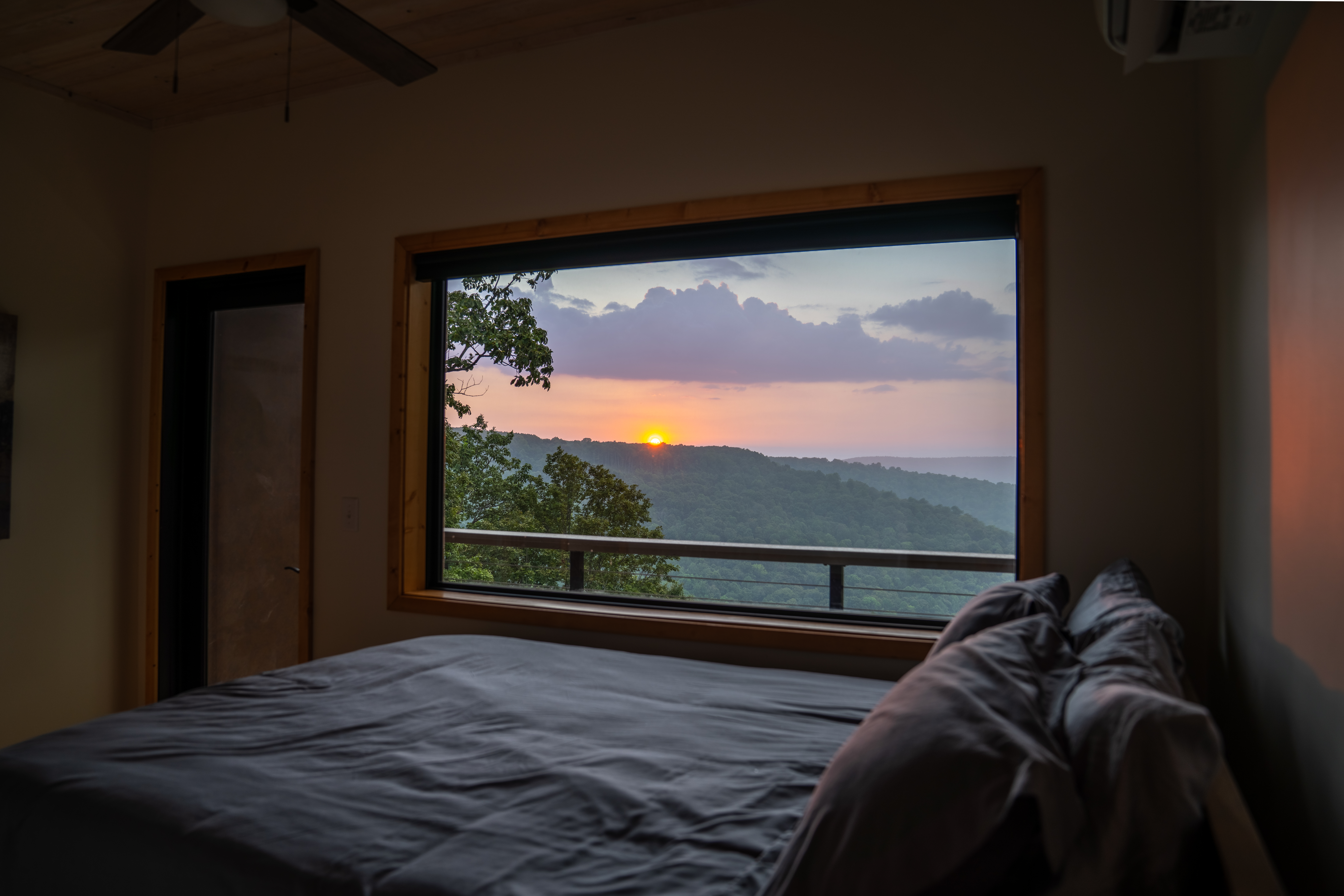 Sunrise pours through the windows as the valley slowly wakes below you.